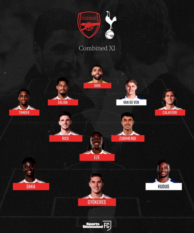 경기를 앞두고 미국 '스포츠 일러스트레이트'가 공개한 통합 베스트11 결과는 충격적이었다. 4-3-3 포메이션에서 토트넘 선수는 단 두 명 뿐이었다. 아스널에서는 빅토르 요케레스, 부카요 사카, 에베레치 에제, 마르틴 수비멘디, 데클란 라이스, 리카르도 칼라피오리, 윌리엄 살리바, 율리안 팀버, 다비드 라야 등 9명이 이름을 올렸다. 토트넘은 모하메드 쿠두스미키 반 더 벤 뿐이었다.