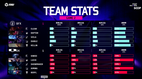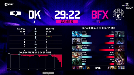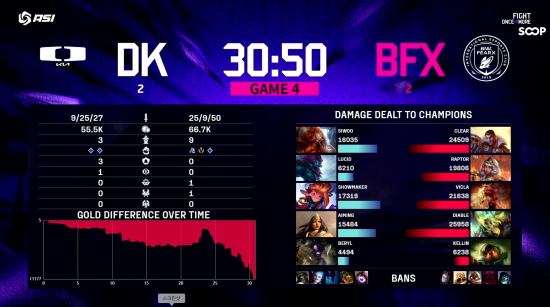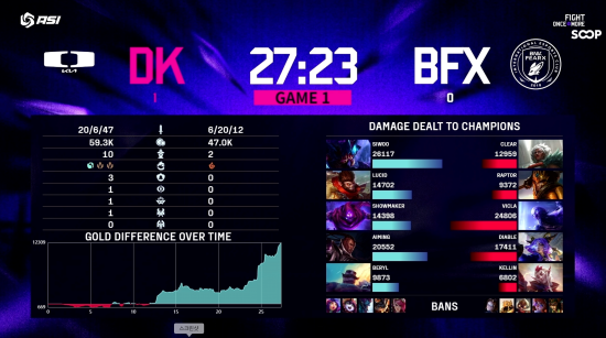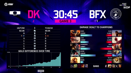 미드 교전에서 ‘에이밍’의 궁극기가 폭발하며 흐름은 완전히 DK 쪽으로 기울었다. 이후 ‘쇼메이커’가 ‘디아블’을 끊어내며 바론까지 챙긴 DK는 공세를 이어가 BFX의 넥서스를 파괴, 세트 스코어 2:1로 앞서갔다.
