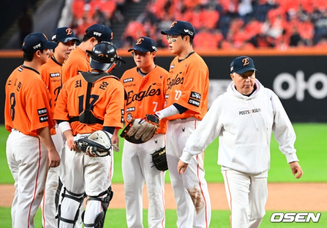 김경문 감독이 이례적으로 직접 마운드를 방문했고, 배터리와 내야수들까지 다 불러모아 다독이고 내려갔다. 그러나 김서현은 김태훈에게 좌전 안타를 맞았고, 강민호를 유격수 땅볼 아웃으로 1사 2루가 됐다. 대타 이성규에게 좌측 담장을 맞는 적시타를 허용하며 스코어는 8-9가 됐다.